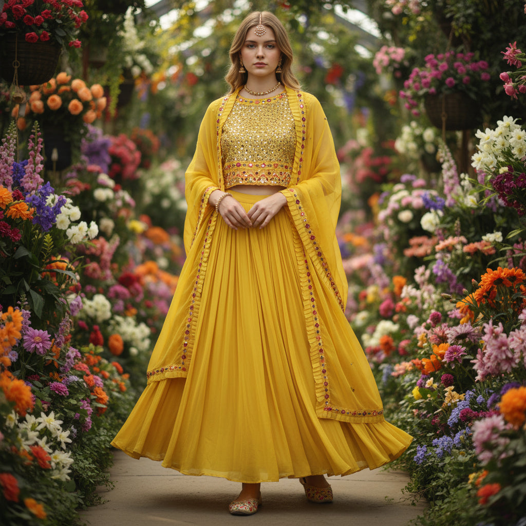 This outfit isn't just about looks; it's designed for a luxurious wearing experience. The ruffled dupatta adds a playful touch, while the mirror work crop top elevates your style, making you shine bright at any event.