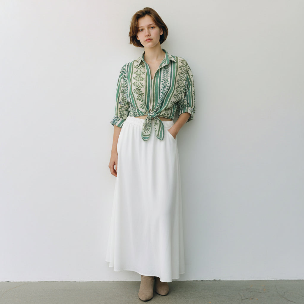 Crafted from lightweight paper chinon, it drapes fluidly over your body, offering a whisper-soft texture that feels like a cool breeze against your skin. The relaxed fit doesn’t just look effortless; it actively works to enhance your comfort.