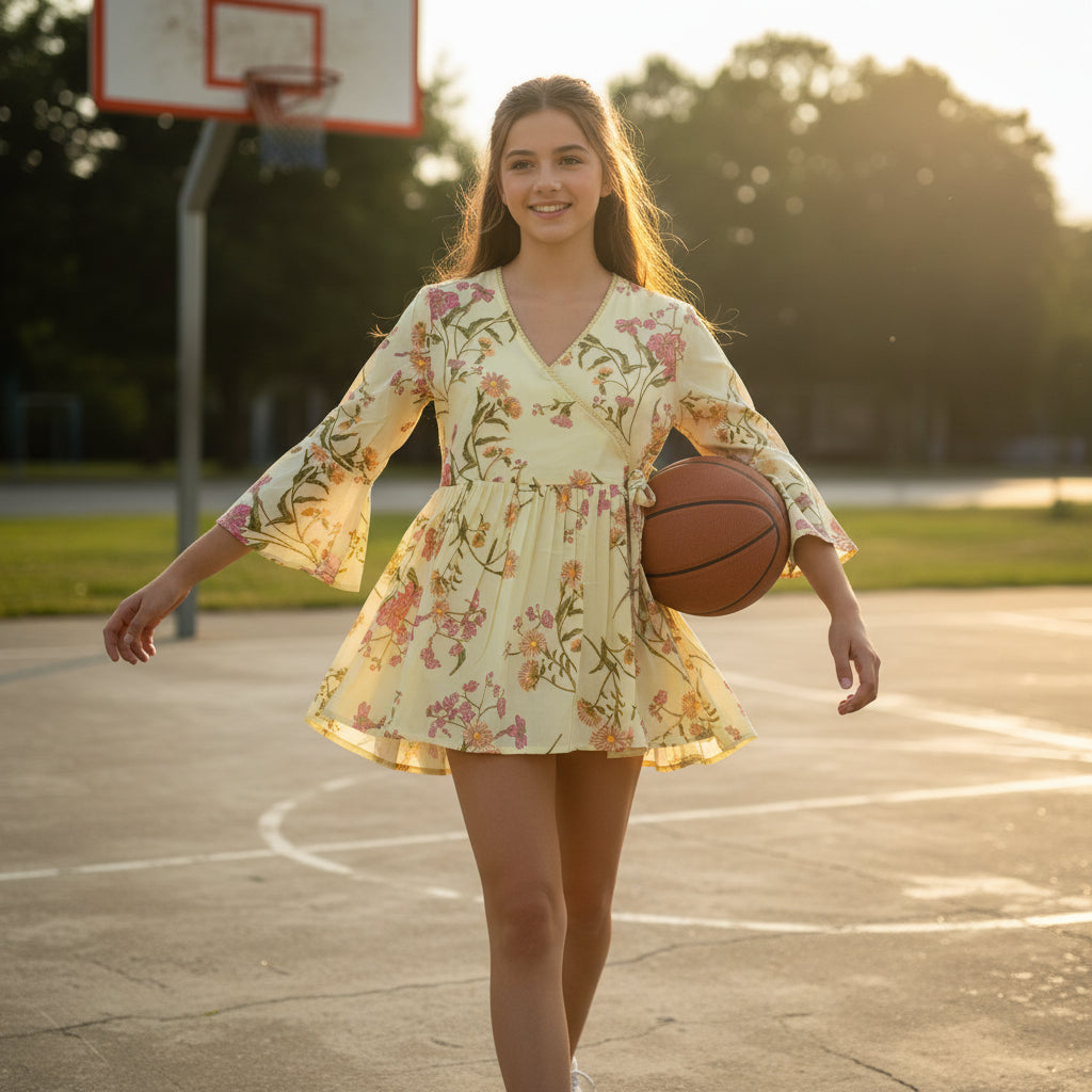 This piece embraces your body with a flattering wrap style, featuring a V-neckline and graceful bell sleeves. The tie-up detail at the waist not only adds an element of elegance but also allows you to personalize the fit. Imagine the delightful sensation of light, airy fabric against your skin, all while looking effortlessly polished.