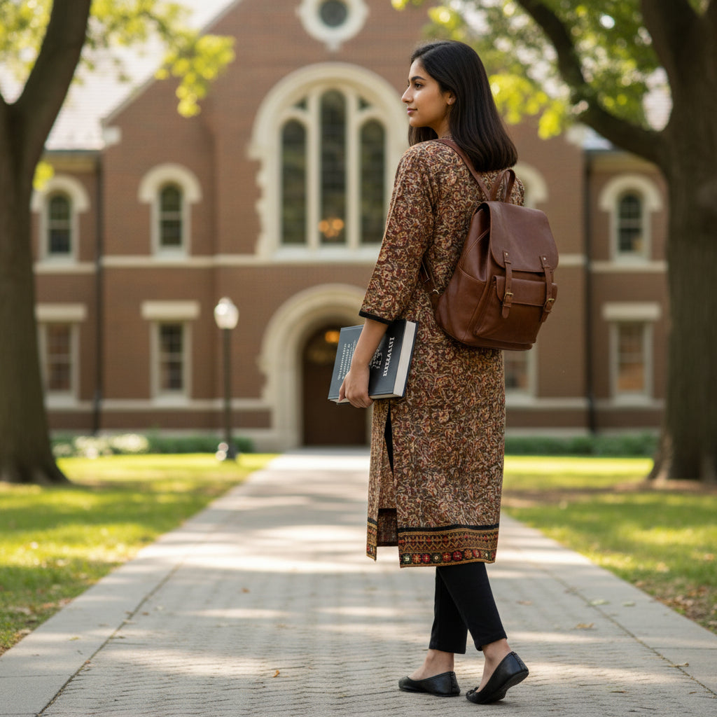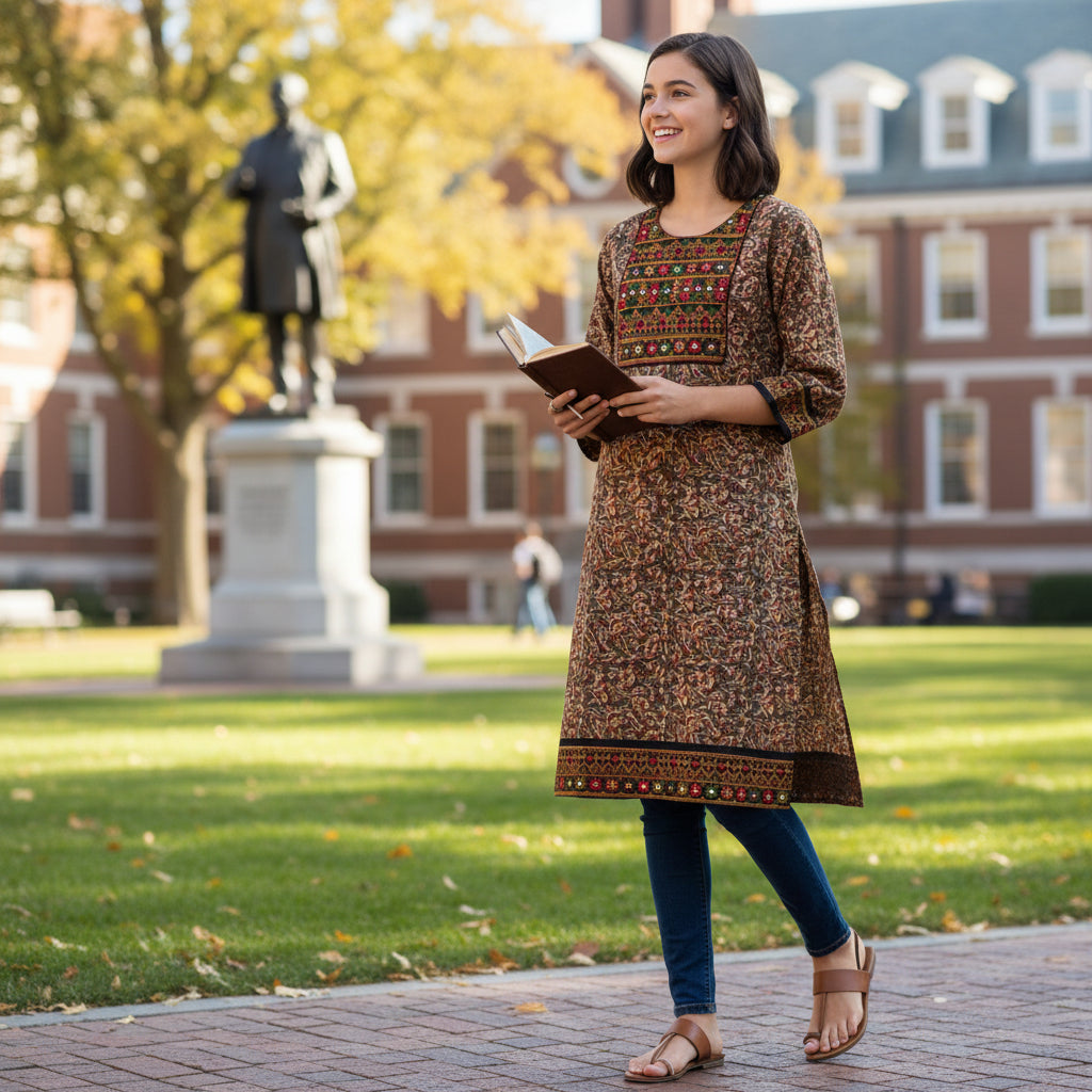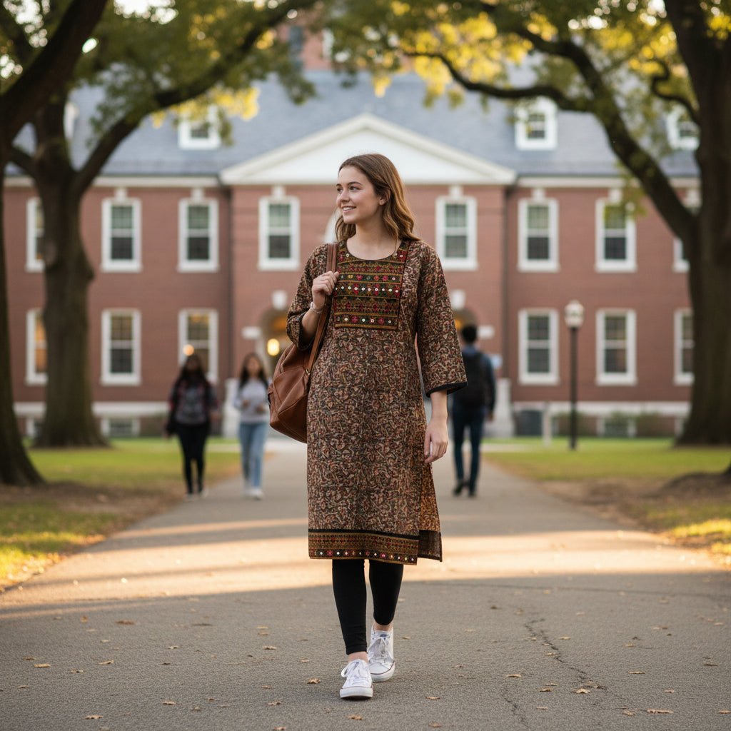 With its soft texture, you'll feel cozy and chic all day, whether you're heading to class or grabbing coffee with friends. The traditional embroidered bib-style yoke adds a touch of elegance without sacrificing comfort.