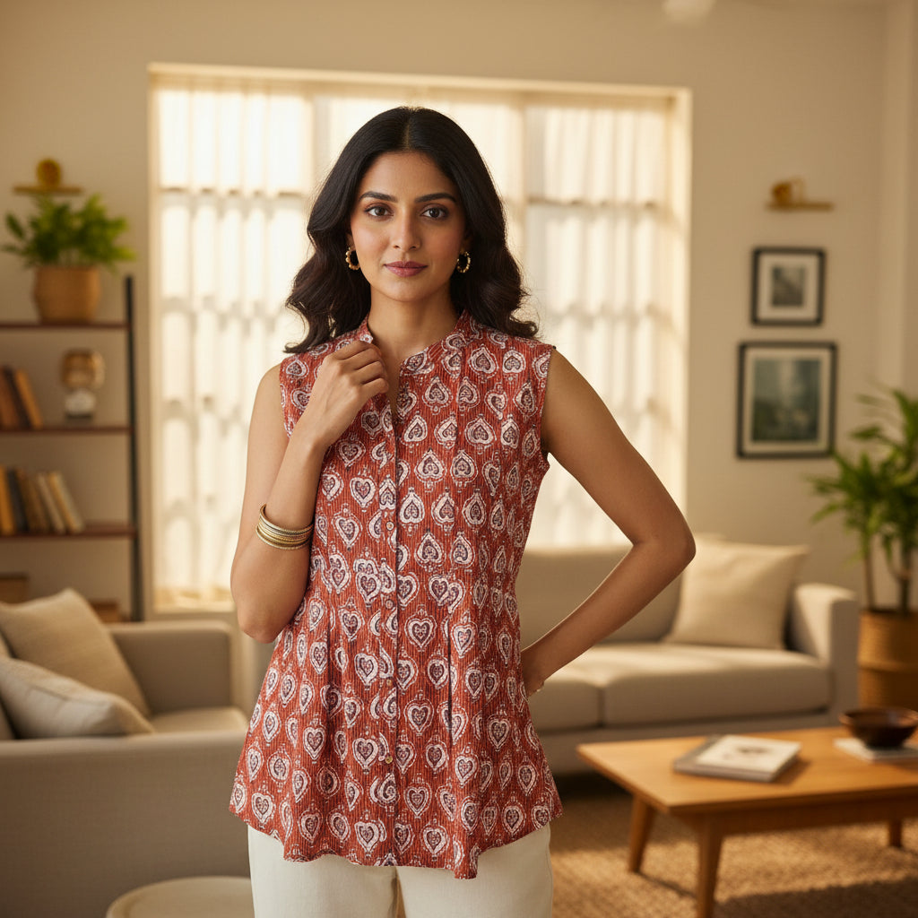 The fabric not only offers comfort, but its delightful heart-leaf print adds a touch of fun to your day-to-day look. Designed without sleeves, this piece moves with you, making it perfect for casual outings or dressier occasions.