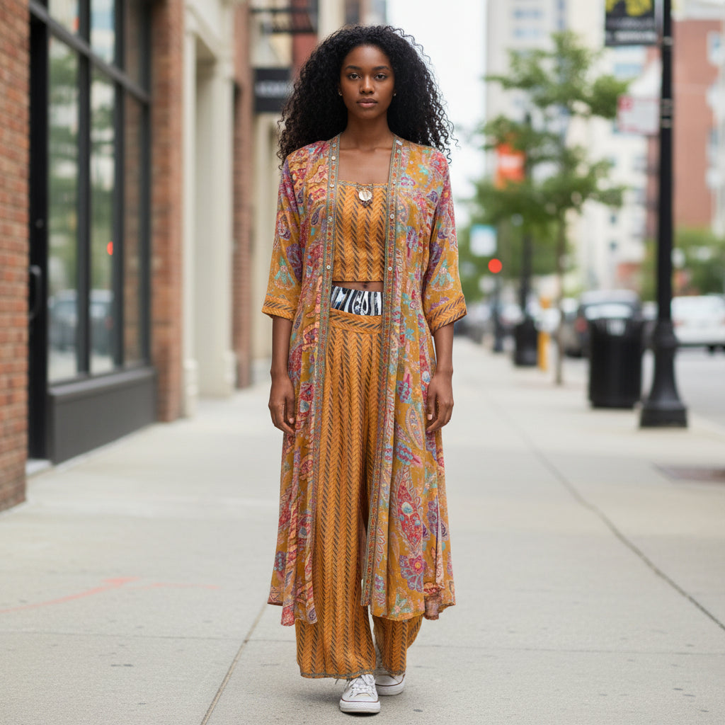 Thanks to the airy fabric, it drapes beautifully without compromising on structure, keeping you cool and comfortable all day. The wide-leg trousers and crop top help you embrace a chic, relaxed vibe, while the matching long paisley shrug adds a touch of elegance and versatility.