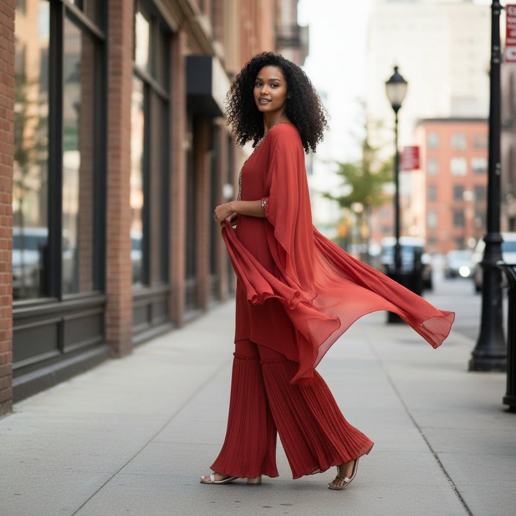 Feeling uncomfortable in clingy fabrics that highlight every curve can be a hassle, especially when you want to step out with confidence. Our solution seamlessly blends style and comfort. Crafted from lightweight crepe and flowing georgette, this set feels soft against the skin while allowing for effortless movement.