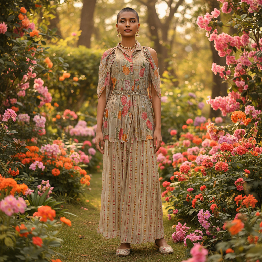 | Category & Style | Designer Co-ord set, Female, Indo Western, Printed fabric with metallic gold vertical pinstripes |
