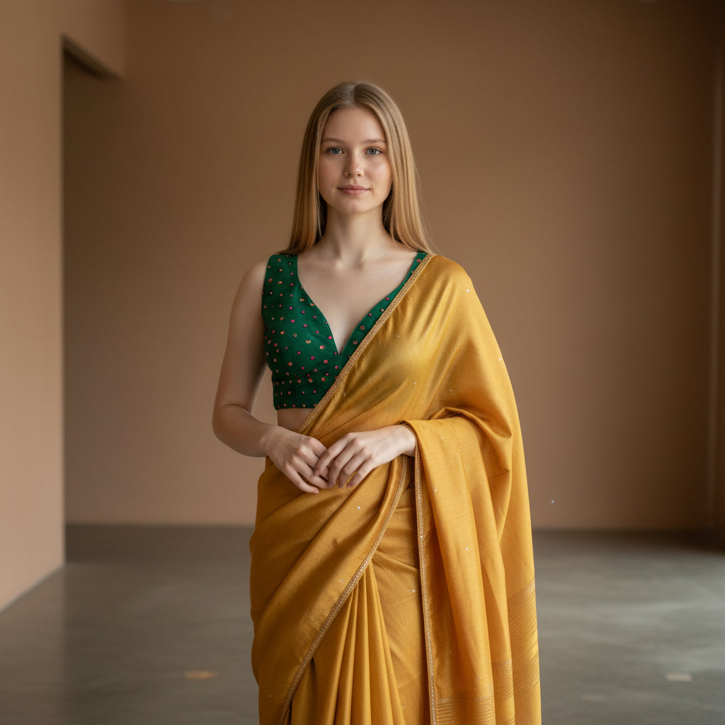 Crafted from a premium silk blend, it’s tailored to allow airflow while maintaining an elegant silhouette. The mirror work adds an exquisite touch, making you shine without the fuss.
