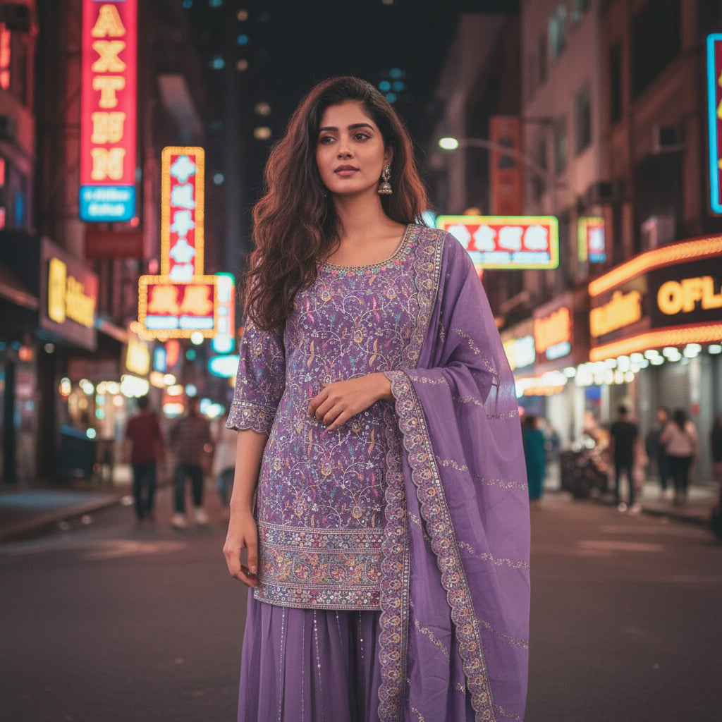 Ever felt restricted by heavy fabrics that trap heat and cling? We’ve all been there. This stunning sharara set, crafted from lightweight tissue georgette, offers a breathable solution that keeps you cool and free to move.