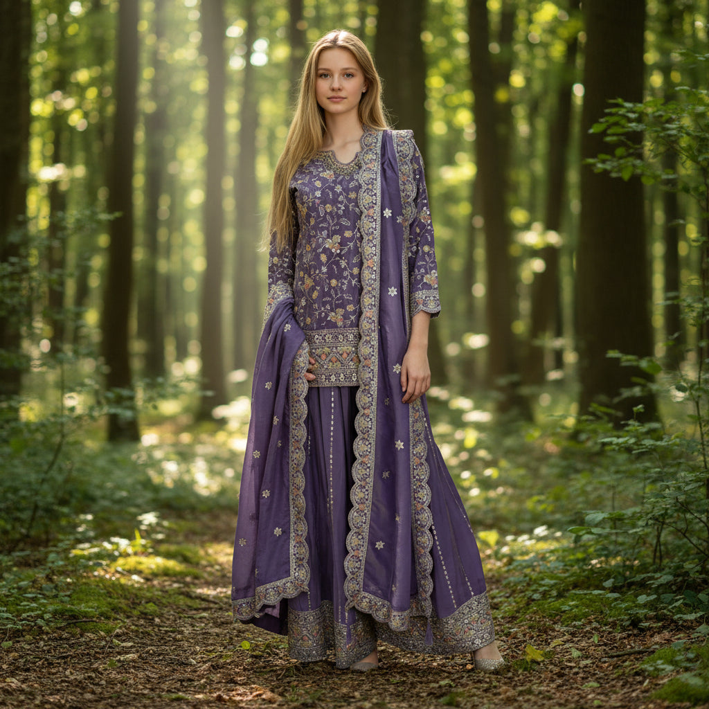 Tired of outfits that cling uncomfortably and leave you fidgeting all day? With this dusky purple sharara set, you won’t have to worry about that. Made from high-quality tissue georgette, this fabric offers a lightweight feel that flows beautifully without sacrificing comfort.